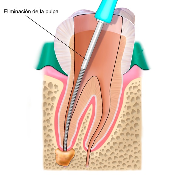 El tratamiento de endodoncia está indicada para salvar el diente y prevenir la expansión de la infección. La pulpa infectada e inflamada es eliminada del diente y el canal de la raíz se limpia de bacterias. Después de que las bacterias hayan sido eliminadas, el canal se rellena y se sella.